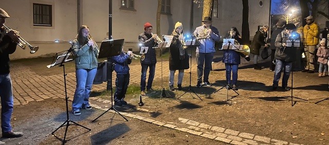 Neben der Feuerstelle wartete schon der ev. Posaunenchor auf uns um gemeinsam die Martinslieder zu spielen und zu singen.